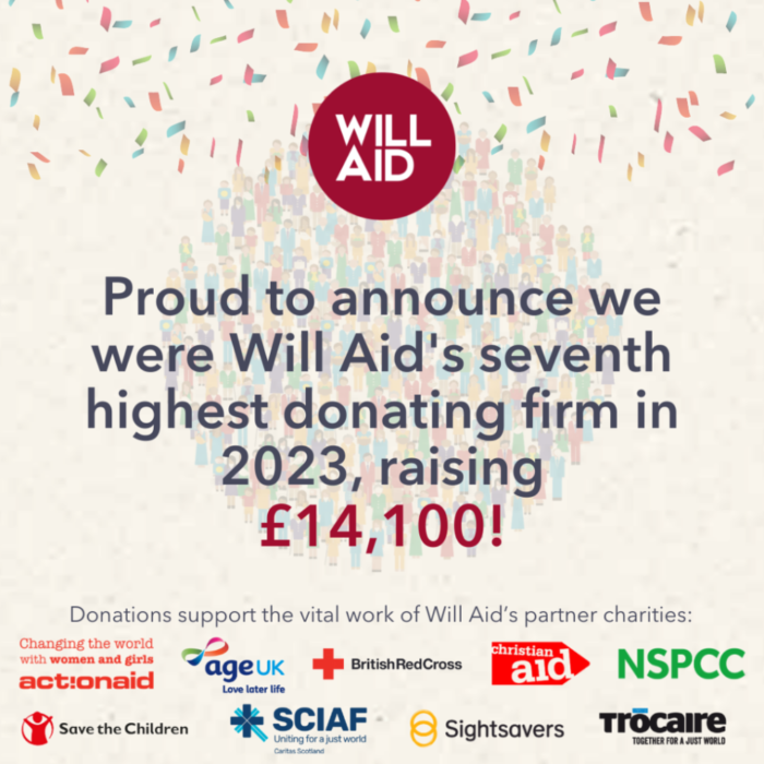 Will Aid is a special partnership between the legal profession and nine of the UK’s most-loved charities. The charities in 2023 were ActionAid, Age UK, British Red Cross, Christian Aid, NSPCC, Save the Children, SCIAF, Sightsavers and Trocaire.